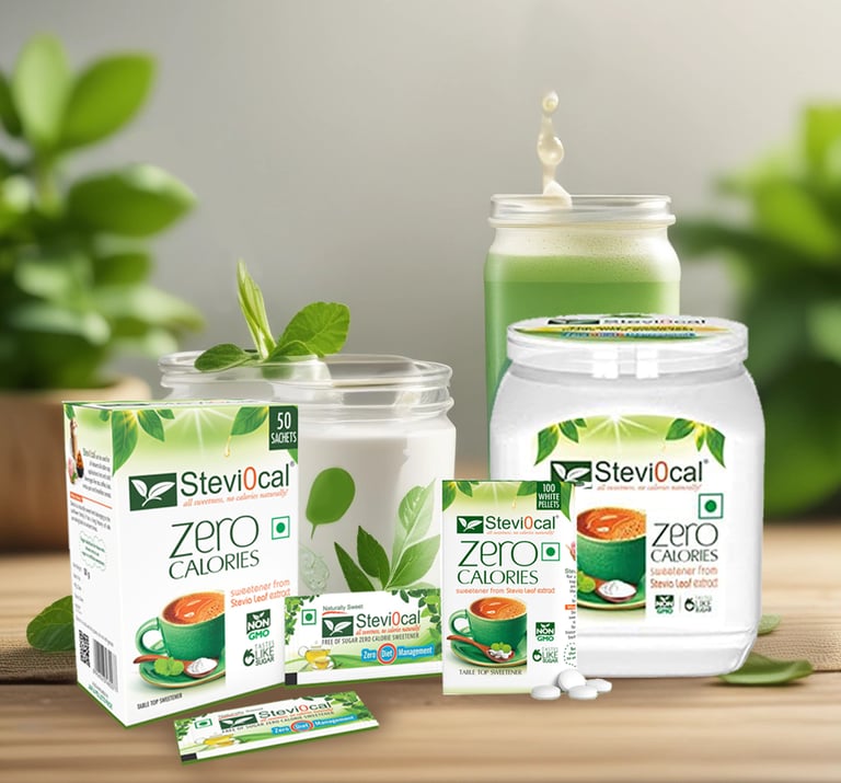 Tabletop Stevia-based sweeteners in sachets, jars, and drops — ideal for daily sugar-free living.